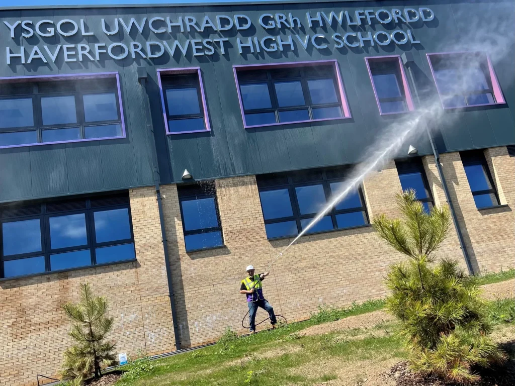 A cladding jet wash down refers to the process of cleaning the external cladding (the outer layer or skin of a building) using high-pressure water jets. This method is often used to remove dirt, moss, algae, pollutants, and other grime from the surface of buildings, particularly commercial or industrial properties.